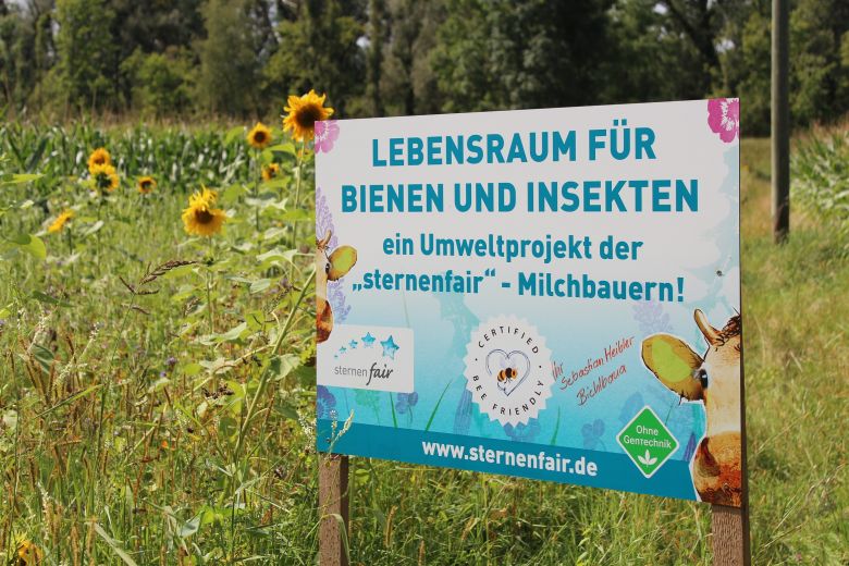 Auf den Blühflächen der sternenfair-Milchbauern hingegen summt und brummt und blüht es den ganzen Sommer über. Die Landwirte sind sich ihrer Verantwortung als Gestalter der Kulturlandschaft und der Bedeutung der Bienen bewusst. Jeder Betrieb hat sich daher verpflichtet ein Umwelt- oder Tierschutzprojekt zu pflegen. Zu den Bienenprojekten gehören unter anderem Blühstreifen, Wildacker mit verschiedenen Blühpflanzen, mehrjährige Blumenacker, extensiv genutzte Flächen, die sehr spät geschnitten werden oder die eigene Bienenhaltung am Hof.