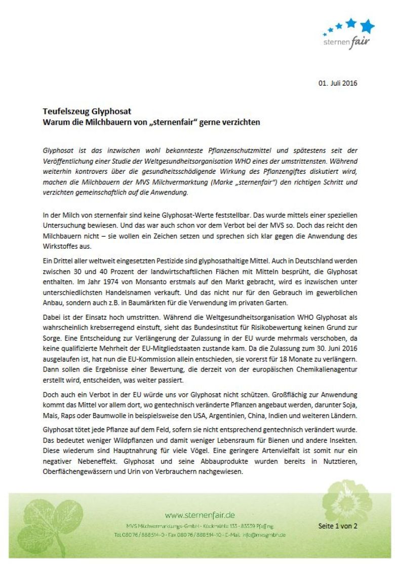 Glyphosat ist das inzwischen wohl bekannteste Pflanzenschutzmittel und spätestens seit der Veröffentlichung einer Studie der Weltgesundheitsorganisation WHO eines der umstrittensten. Während weiterhin kontrovers über die gesundheitsschädigende Wirkung des Pflanzengiftes diskutiert wird, machen die Milchbauern der MVS Milchvermarktung (Marke „sternenfair") den richtigen Schritt und verzichten gemeinschaftlich auf die Anwendung.