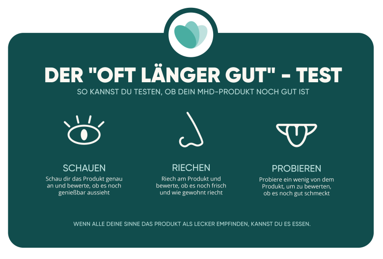 Bevor Sie also ein Produkt, welches das Mindesthaltbarkeitsdatum erreicht hat, wegwerfen, führen Sie bitte selbst den "Oft länger gut"-Test durch.