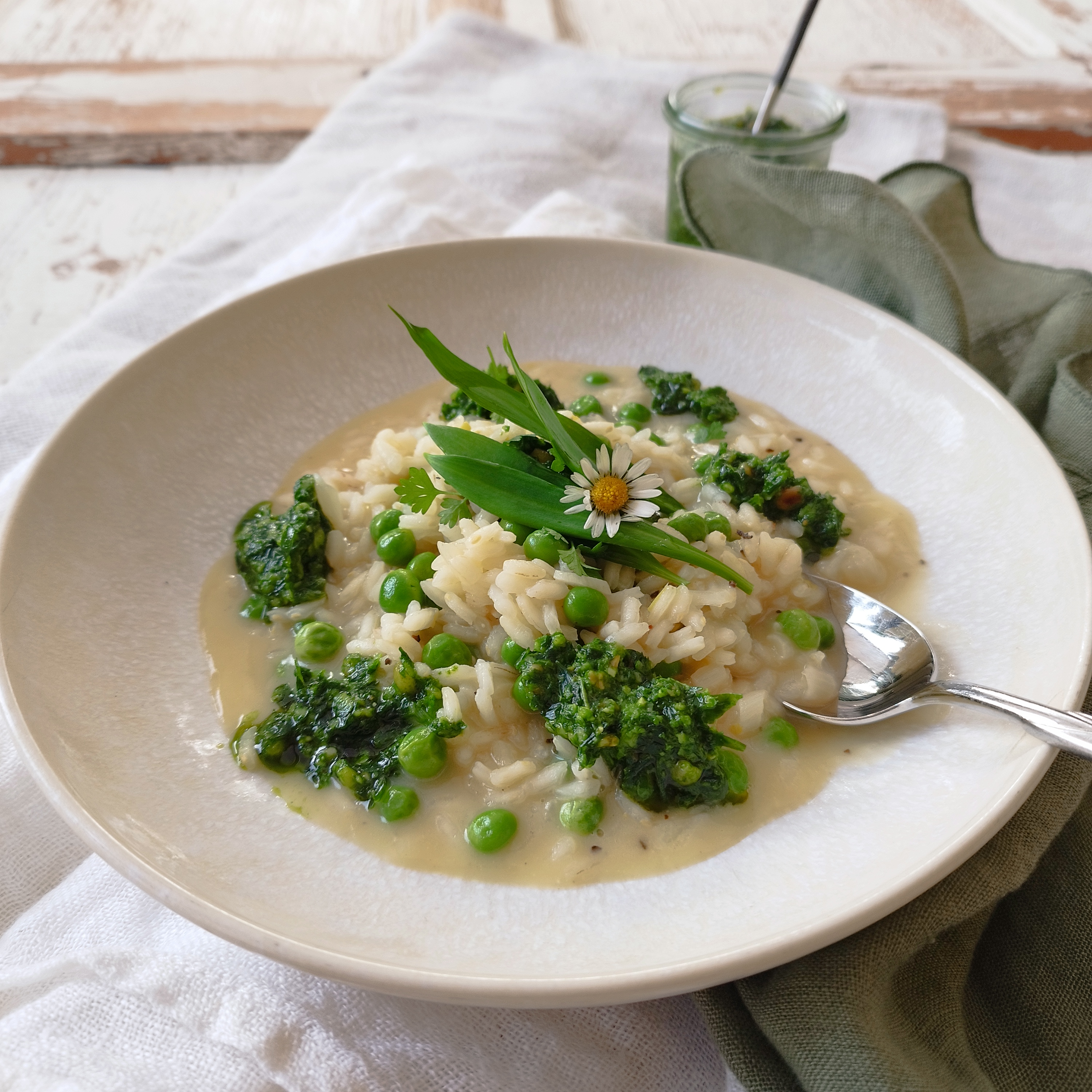5. Den Erbsenrisotto in tiefen Tellern anrichten und rundherum etwas Bärlauchpesto geben. Nach Belieben mit frischem Bärlauch garnieren und gleich servieren.