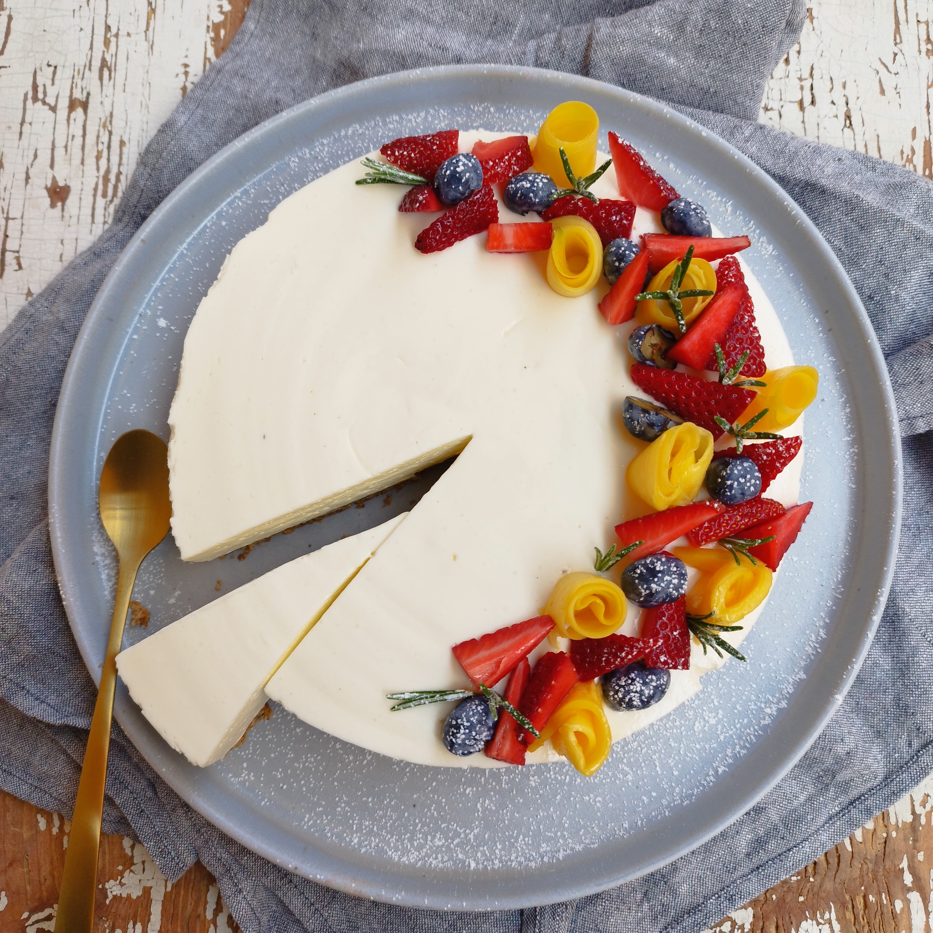 5. Vor dem Servieren den No-Bake-Cheesecake vorsichtig aus der Form lösen und nach Belieben mit frischen Beeren und Früchten garnieren. Leicht mit Puderzucker bestäuben und kalt servieren.
