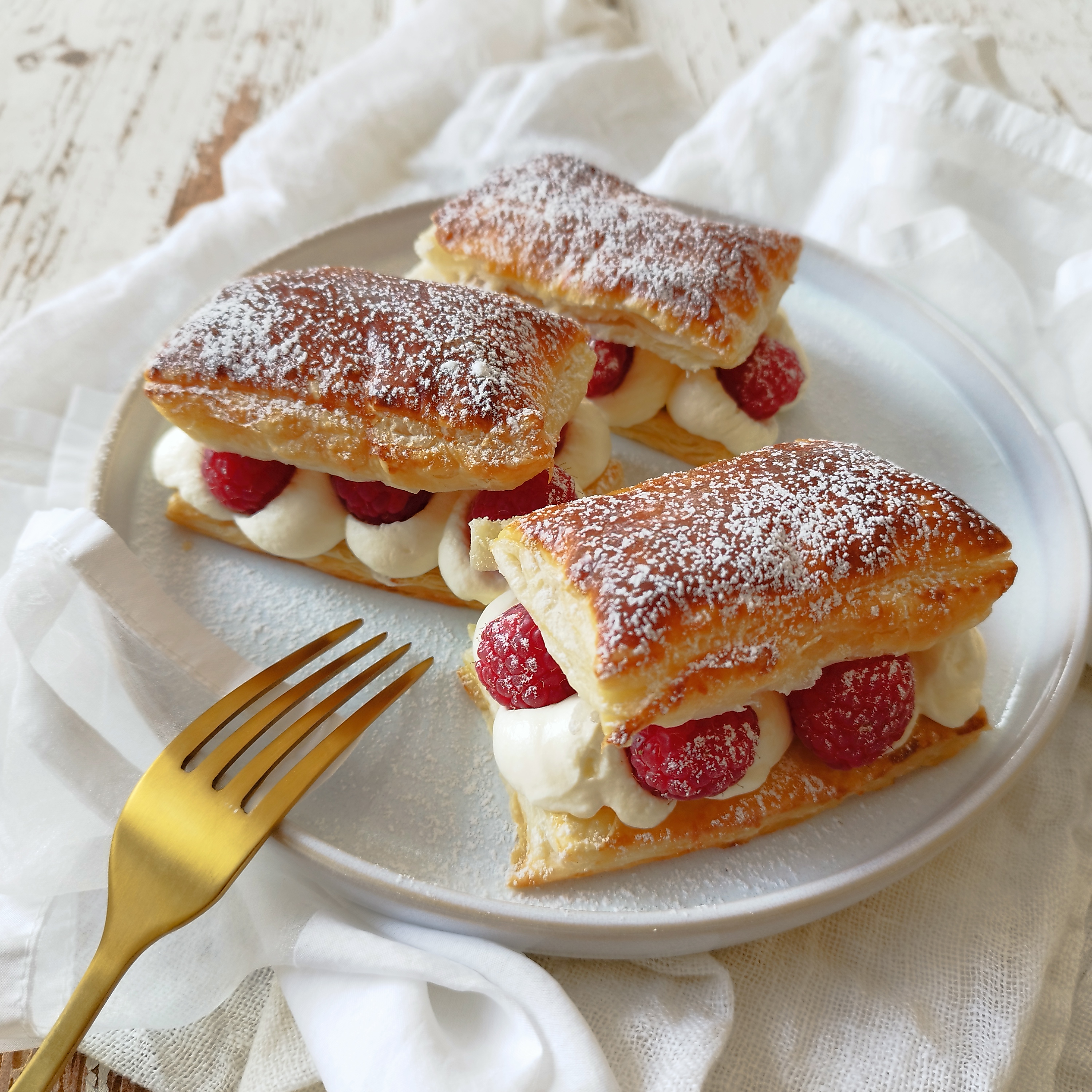 4. Kurz vor dem Servieren die Creme auf die Unterseiten der Blätterteig-Kissen spritzen und mit frischen Beeren garnieren. Dann die Deckel aufsetzen, leicht mit Puderzucker übersieben und gleich servieren.