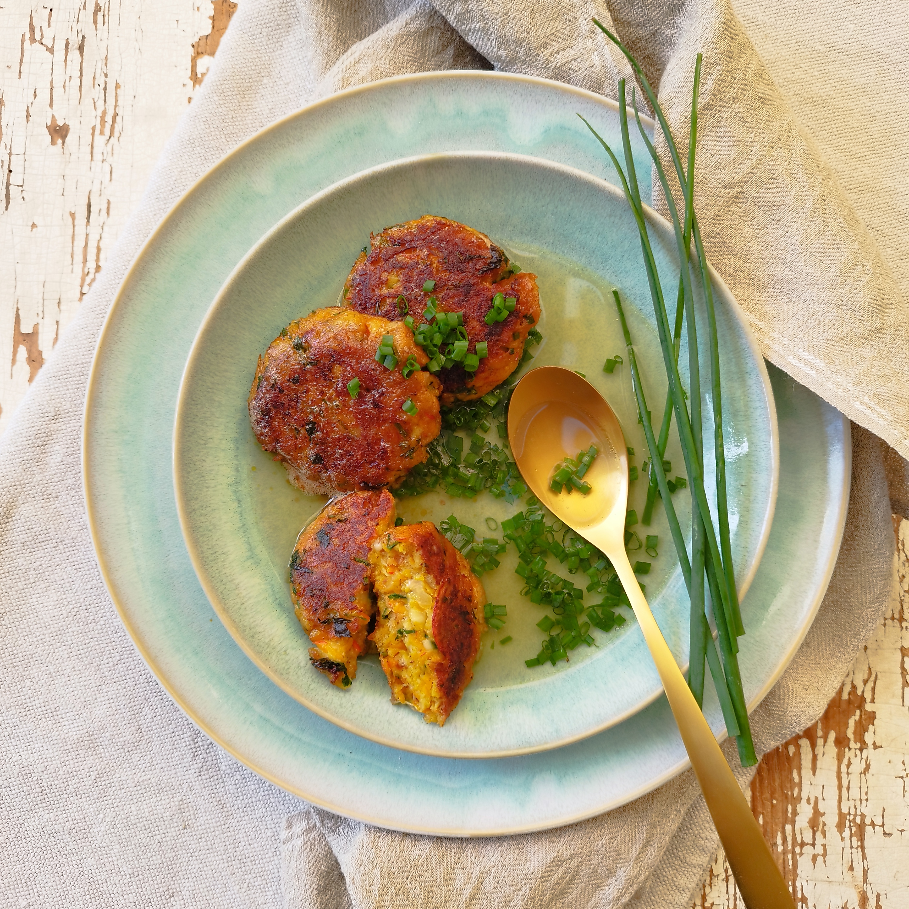 5. Die Butter in 2 Pfannen aufschäumen und die Kaspressknödel beidseitig in etwa 10 Minuten goldbraun und knusprig braten. Die Kaspressknödel dabei öfters wenden.