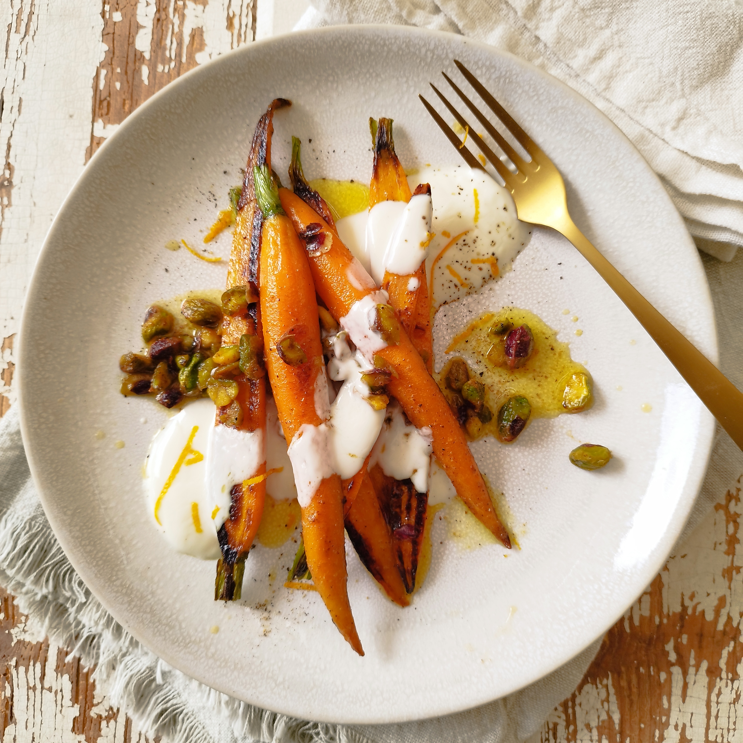 4. Die gerösteten Karotten auf Teller verteilen und mit der Orangen-Pistazien-Butter beträufeln. Zum Schluss den Joghurt darüber geben und mit Orangenzesten garnieren.