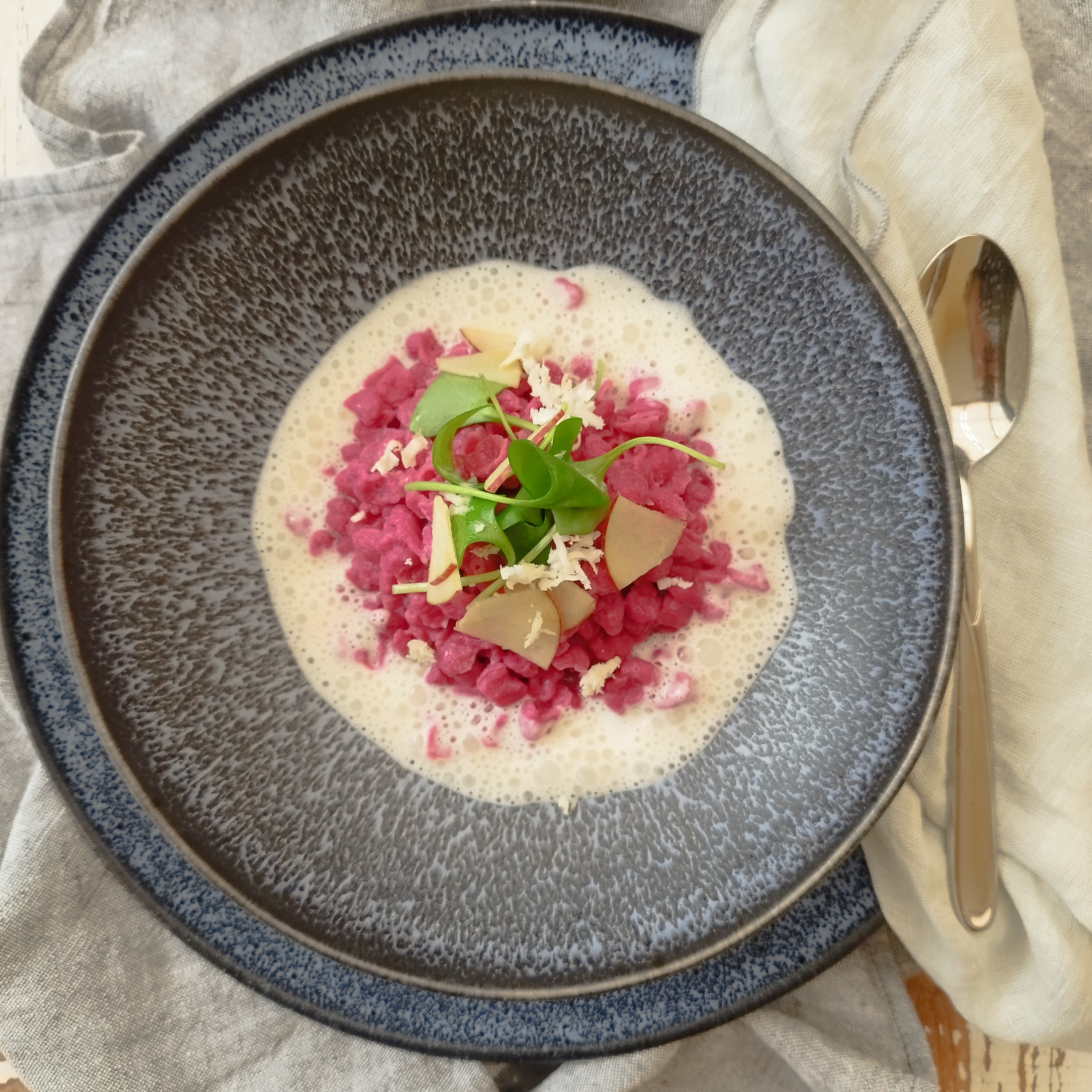 Rote Bete einmal anders - probiert die Vitaminbombe doch mal als Spätzle auf einem herrlichen Apfel-Meerrettichschaum. Sehr gesund und auch ein richtiger Hingucker.