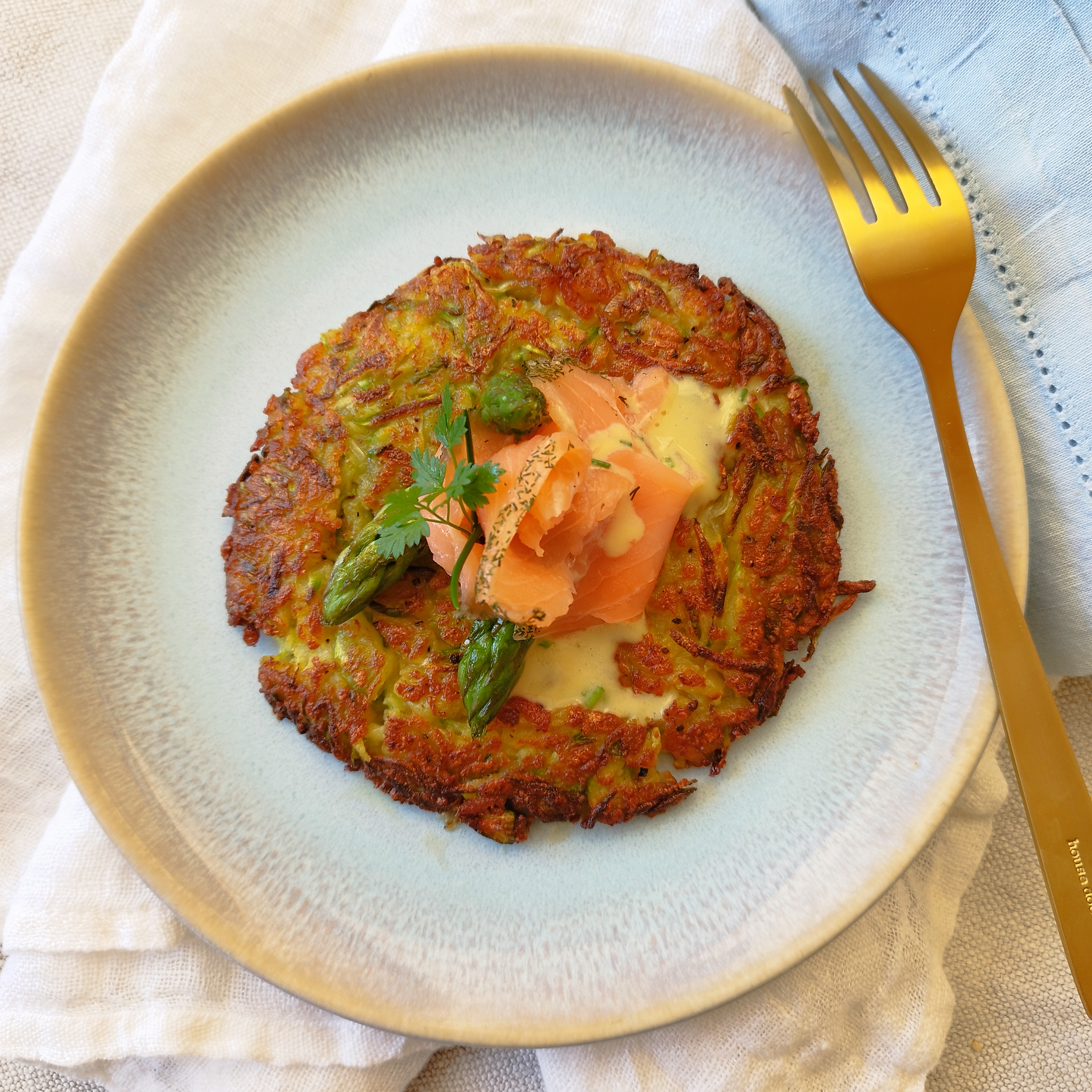 4. Die Spargelrösti mit Räucherlach und dem Honig-Senf-Joghurt servieren.